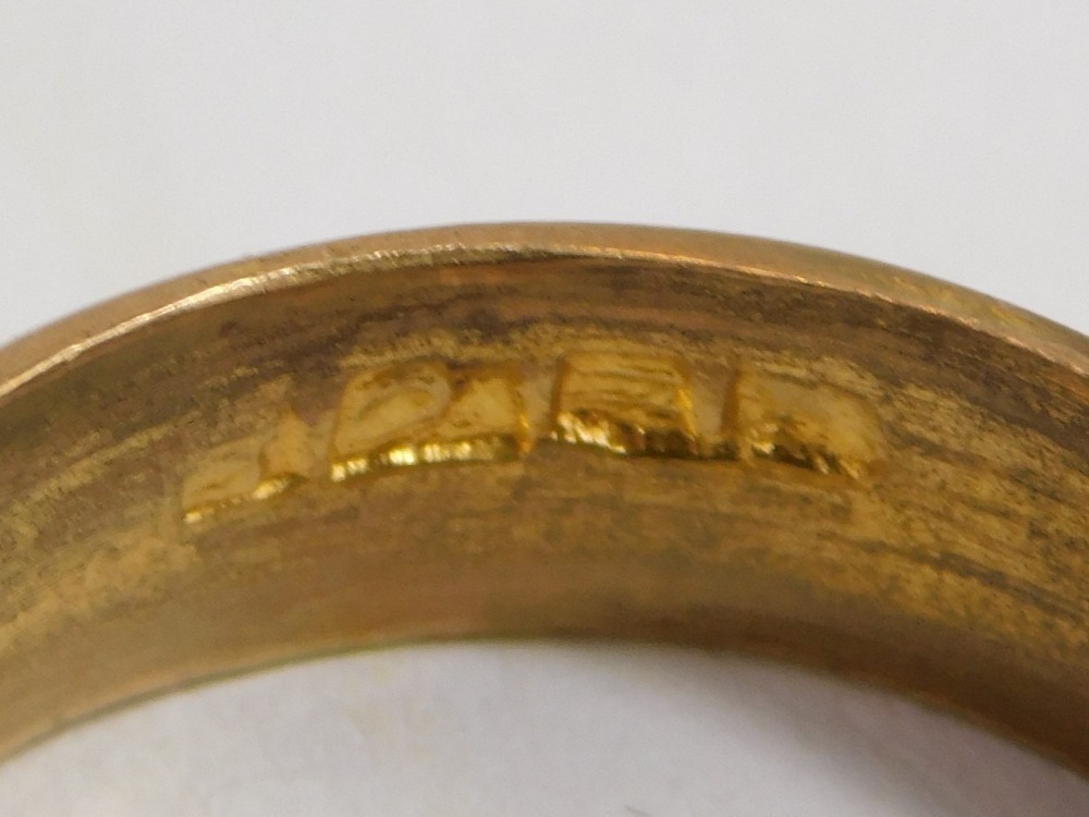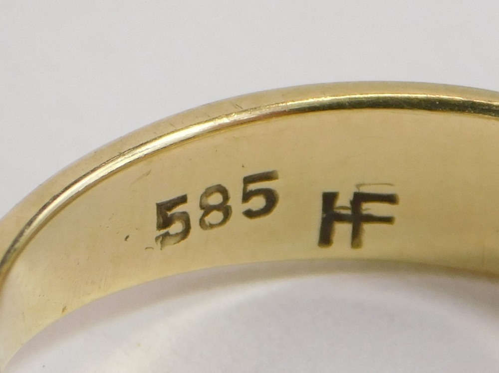 Lot 112AA pair of Chinese jadeite set ear studs, yellow metal, within pierced scroll borders, stamped China 14k, yellow metal ring set with a cultured pearl, stamped 585, 4.6g all in, and a yellow metal wedding band, indistinct marks, 3.7g. (3)