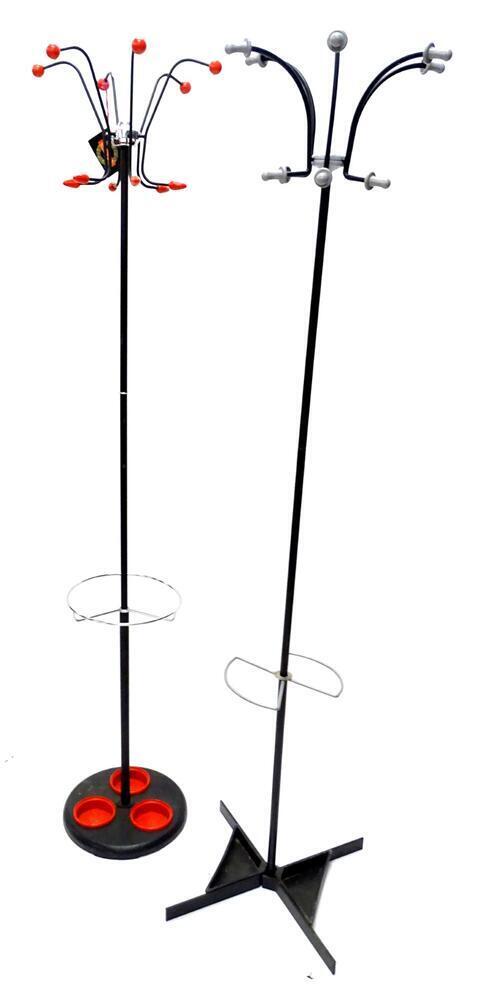 • Two similar 1960s ebonised Hago metal coat stands, each with plastic finials to the shaped hooks etc.